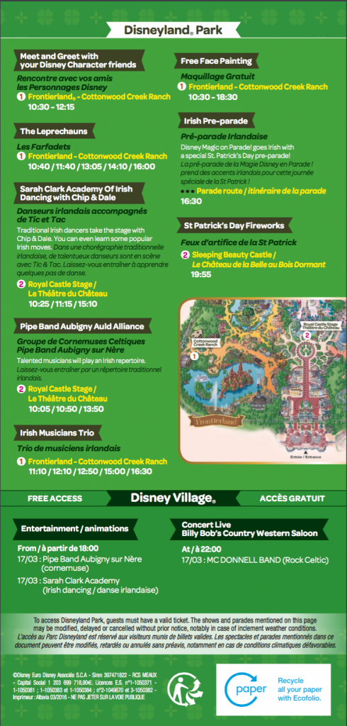 La Saint-Patrick fait partie comme chaque année des fêtes célébrées à Disneyland Paris, c’est une véritable tradition. De nombreux évènements sont organisés, partout, en tous genres. Cependant, Disneyland Paris avait pris l’habitude de célébrer la Saint-Patrick au Cottonwood Creek Ranch qui était l’année dernière inoccupé mais cette année les choses risquent d’être quelque peu différentes, devons-nous rappeler que le spectacle, la Forêt de l’Enchantement, une aventure musicale Disney est présent quotidiennement depuis le début du mois de février. Même si la cohabitation risque de paraître bizarre et inappropriée Disneyland Paris a décidé de maintenir de nombreux évènements dans le Cottonwood Creek Ranch, découvrons au cours de cet article, les différents évènements leurs horaires et leur lieu.