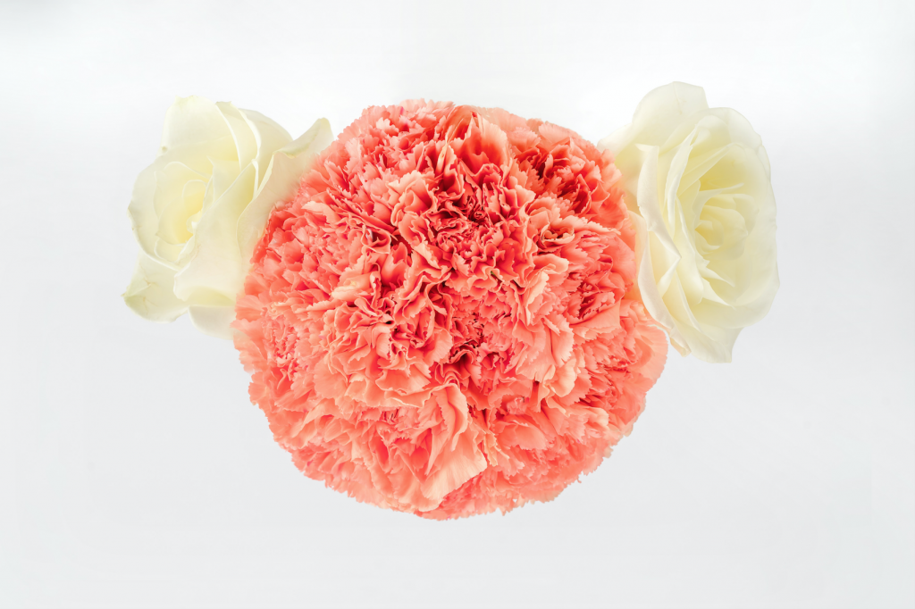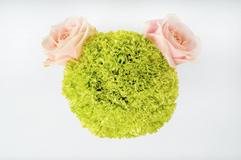 Deux bouquets identiques dans leur forme ont été créés, le Jardin de Minnie alliance subtile de tons vert amande (oeillets Goblin) et rose pâle (roses Avalanche Meijer) et le Spring Bloom qui marie le côté pop des oeillets Chepri oranges à la douceur de la rose Avalanche Meijer blanche. Les deux bouquets reprennent la forme de la tête de Mickey ainsi que celle de Minnie, disponibles en édition limitée au prix de 25 €.