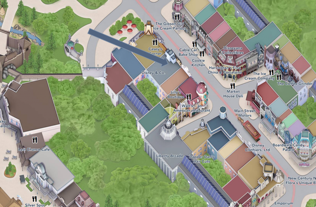 C’est sur l’artère principale du Parc Disneyland qu’il serait le plus logique de trouver ce service, et bien oui dans une des boutiques de Main Street USA qui est le meilleur endroit pour trouver tous produits Disney que se trouve ce super service ! Mais Main Street est d’une taille colossale et se compose de dizaines de boutiques toutes ouvertes entre elles, alors pour les visiteurs occasionnels comment se repérer ? C’est d’abord le nom de la boutique qui vous aidera : Disney & Co.